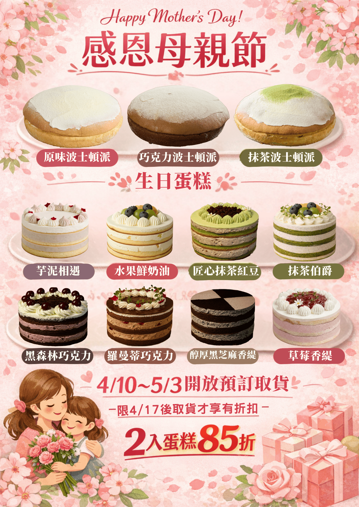 門市取貨限定謝謝妳,最親愛的媽媽👩🩷🌷屬於您的節日留下最難忘的回憶❣️在每個平凡的日子裡,媽媽總是默默付出、用心守護。今年母親節,讓我們用一份充滿愛的甜點,輕輕對她說一聲:「妳辛苦了,謝謝妳一直都在。」 Baker Yea 精選多款人氣生日蛋糕與波士頓派,任搭自由配,甜在嘴裡、暖在心裡💌即日起至 5/03 開放預訂,預購兩入享 85 折! 今年母親節,不止口頭感謝!用一份甜點,為媽媽的母親節,留下最美的回憶ᰔ