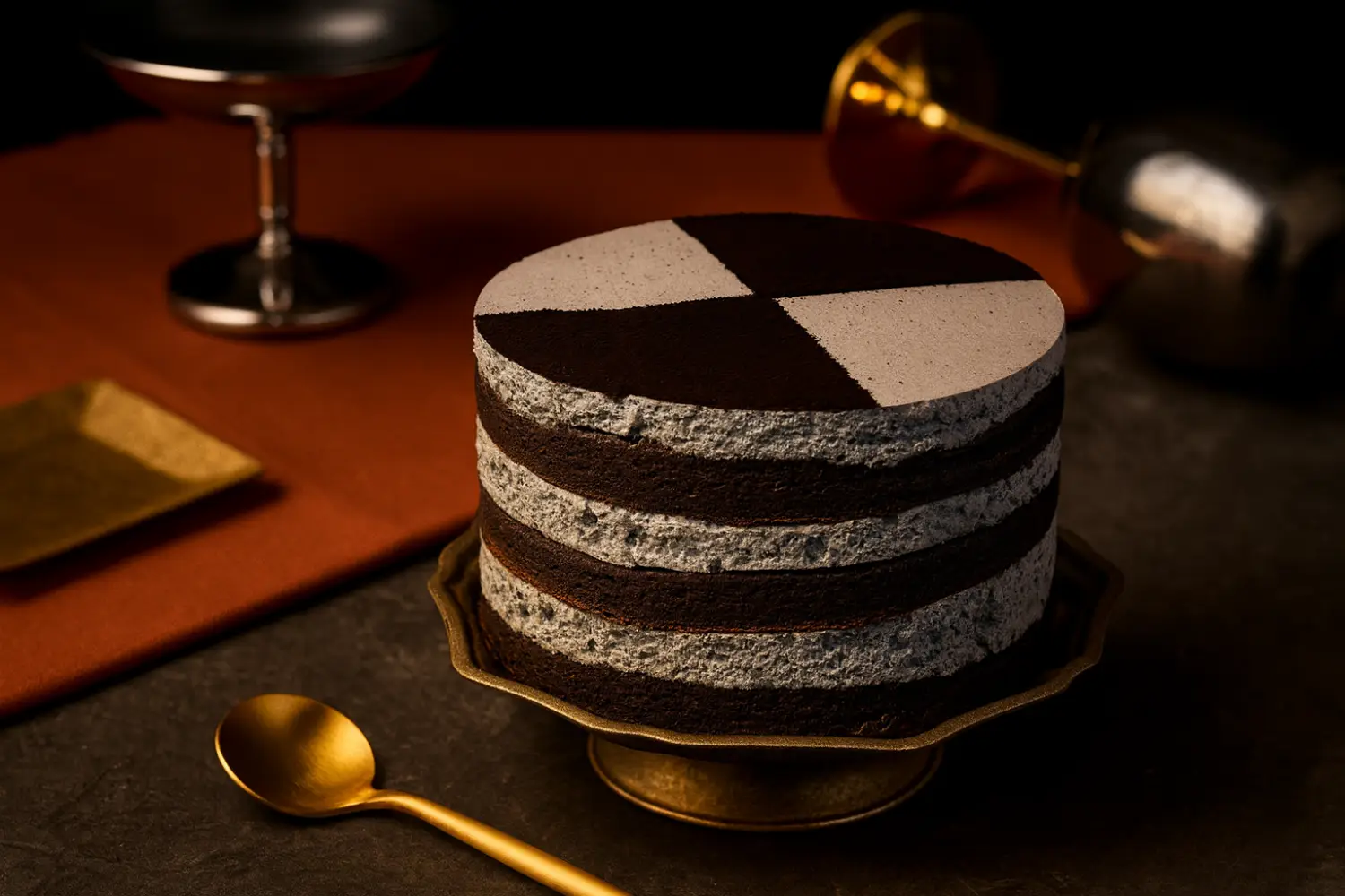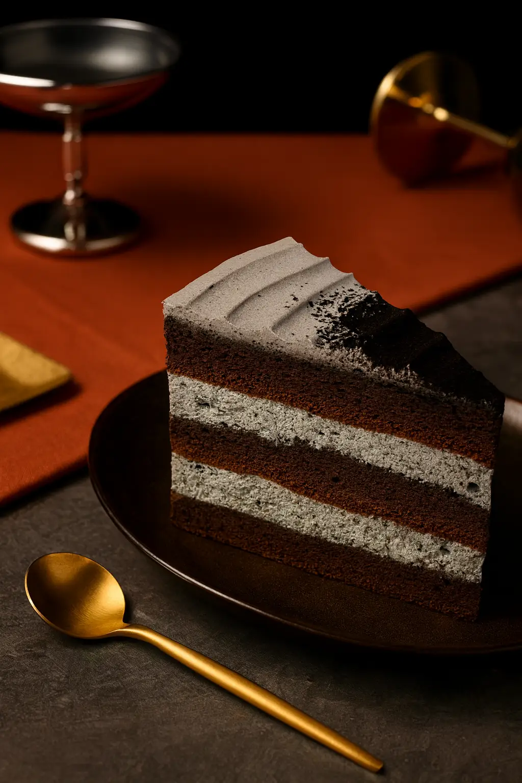 嚴選黑芝麻製成的綿密香緹與鬆軟巧克力蛋糕體層層交織,口感厚實卻不甜膩。