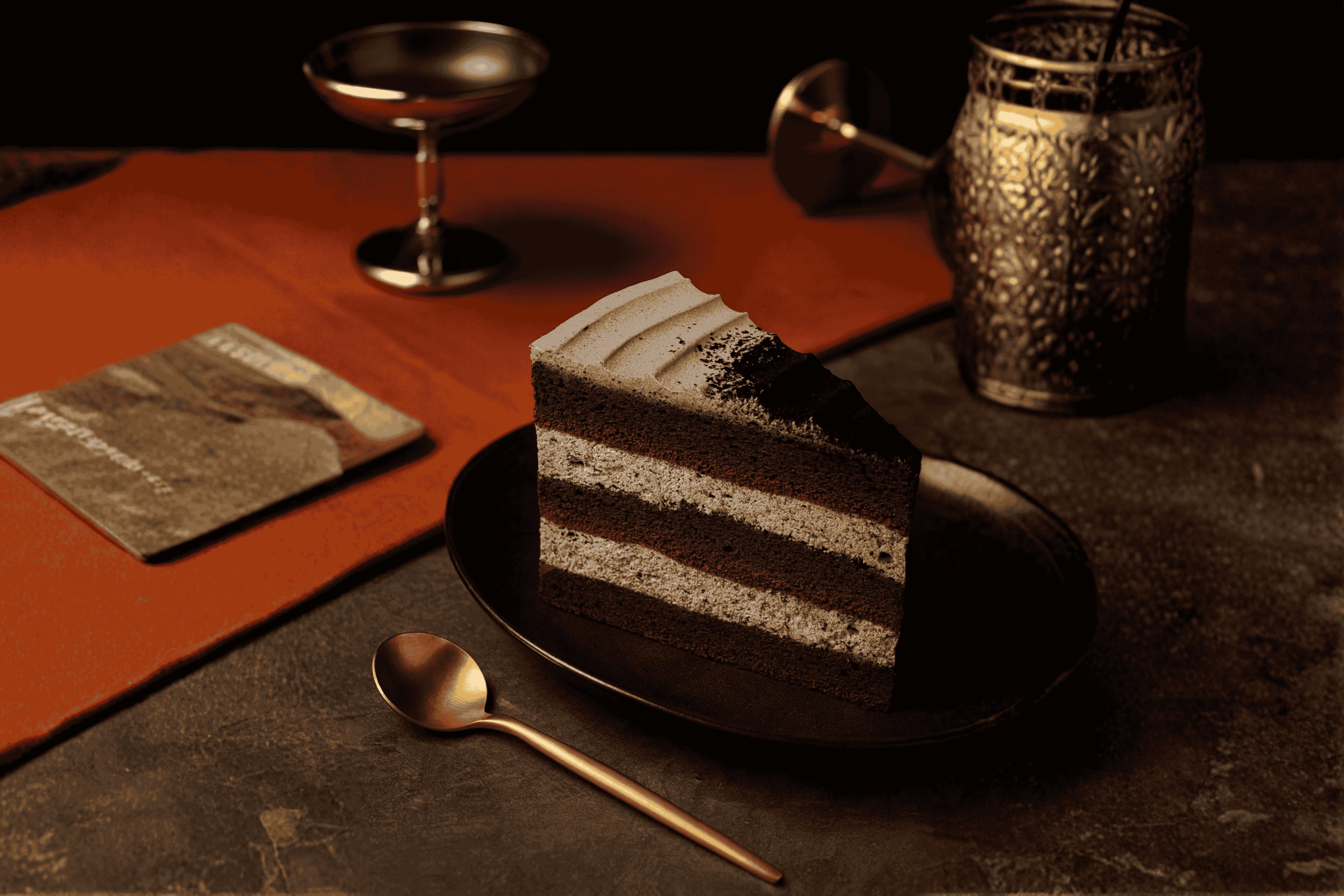 嚴選黑芝麻製成的綿密香緹與鬆軟巧克力蛋糕體層層交織,口感厚實卻不甜膩。
